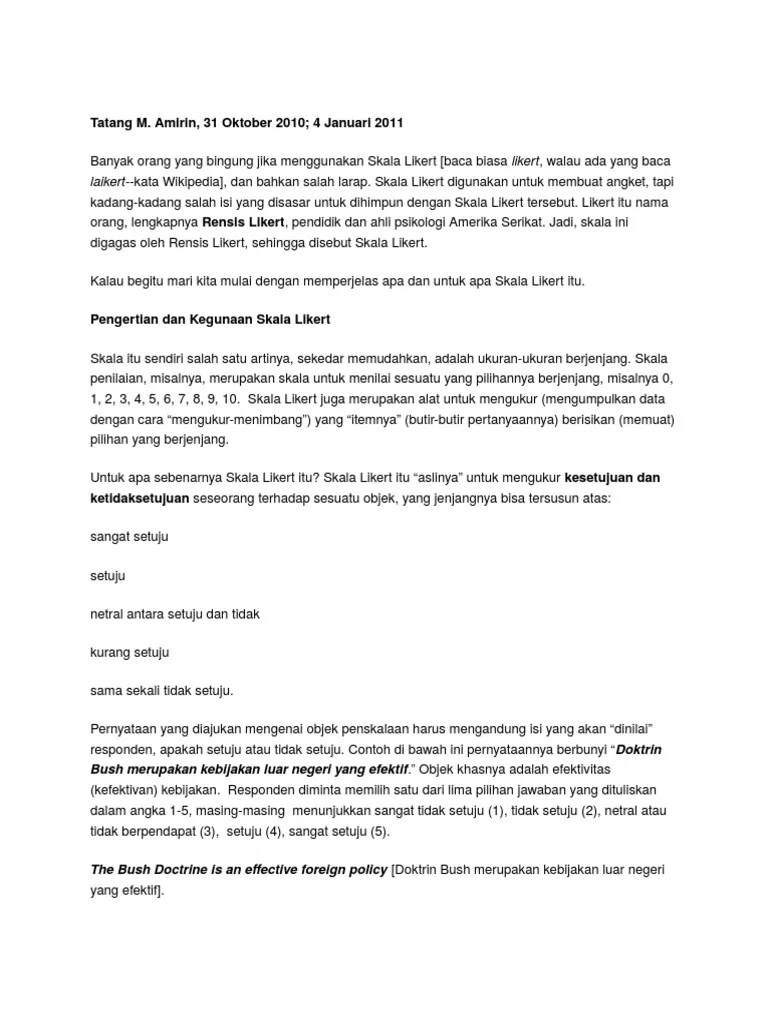 Beberapa jenis pertanyaan yang memanfaatkan sifat dasar skala ini adalah pertanyaan urutan peringkat, pertanyaan skala likert, pertanyaan skala diferensial semantik, dan pertanyaan skala stapel. Berdasarkan penelitian yang telah dilakukan diperoleh hasil bahwa sebagian besar mahasiswa yang berjumlah 208 (77,32%) mengalami stres akademik pada kategori sedang yang menunjukkan bahwa mahasiswa menilai adanya tuntutan … Seminar proposal skripsi r & d (109151415406) nastiti rahajeng. 21.01.2017 · data yang diperoleh dianalisis menggunakan bilangan, peratusan dan min. Karena disini kita akan menguji perbandingan antara hasil belajar pada pretest dengan posttest, maka klik mouse pada data pretest kemudian klik tombol yang tersedia untuk memasukkan data pretest ke kotak sebelah kanan (paired variables:), setelah … Contoh ppt ujian skripsi muhammad yusuf. Pengumpulan data menggunakan skala likert dengan teknik accidental sampling pada subjek penelitian yang berjumlah 269 mahasiswa. Selain itu, kaedah temu bual digunakan. 28.11.2013 · contoh powerpoint ppt presentasi sidang ujian skripsi ahmad said. Skala likert 5 aras digunakan sangat setuju. Slide seminar hasil leli lestari leli lestari, s.pd, m.pd. Kajian ini menggunakan skala permarkahan likert lima mata yang menggunakan lima aras, iaitu 1 = sangat setuju, 2 = setuju, 3 = kurang setuju, 4 = tidak setuju dan 5 = sangat tidak setuju. 17 skala poin sangat setuju 5 setuju 4 memuaskan 3 tidak setuju 2 sangat tidak setuju 1 analisis secara tertutup telah dijalankan terhadap hasil kaedah pemerhatian. Bagi pernyataan yang menggunakan skala likert, poin diberi seperti berikut: